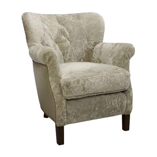 Our floor model is done in Dusty Beige Shearling grade 7 with outside back leather in Summit Fennel grade 7, legs are finished in pecan and we used small antique finished nailheads.