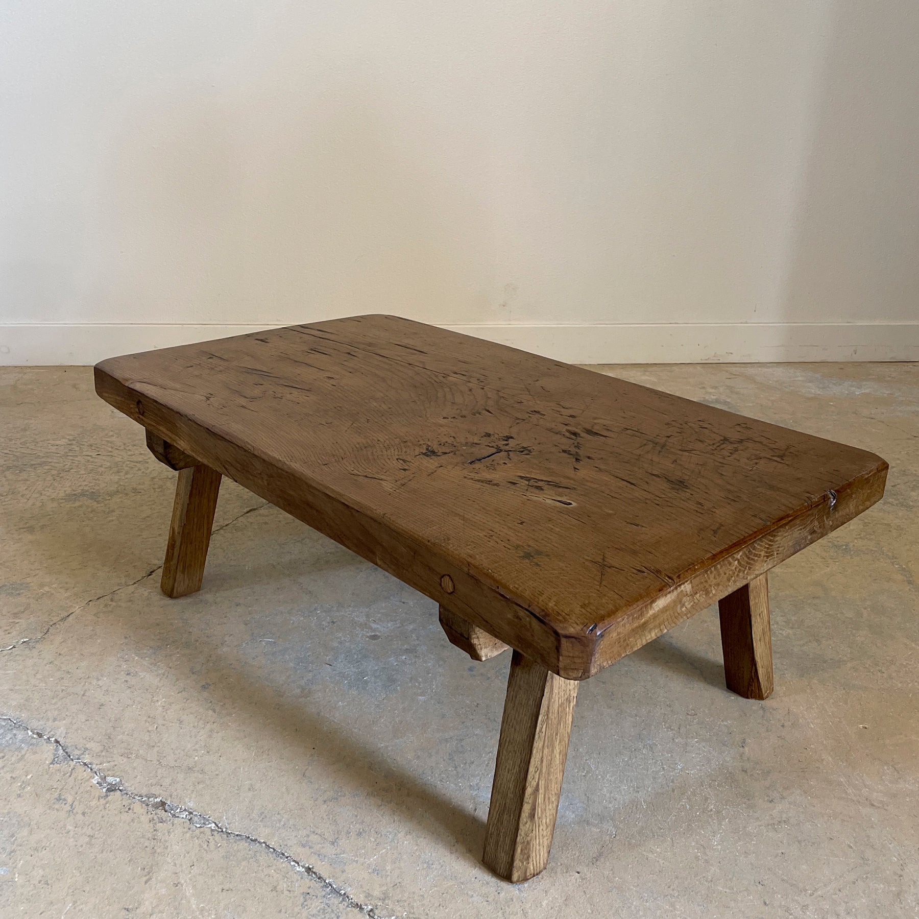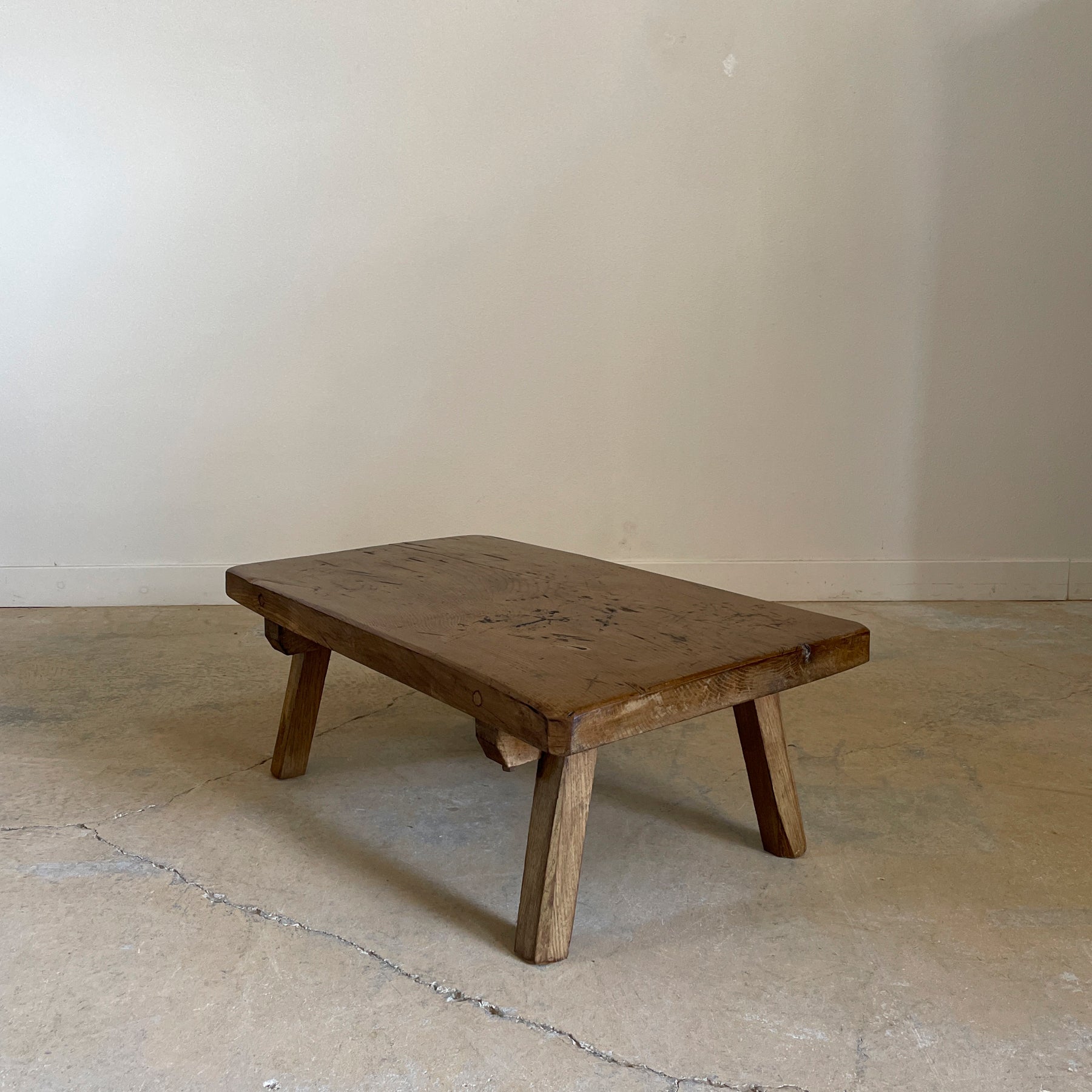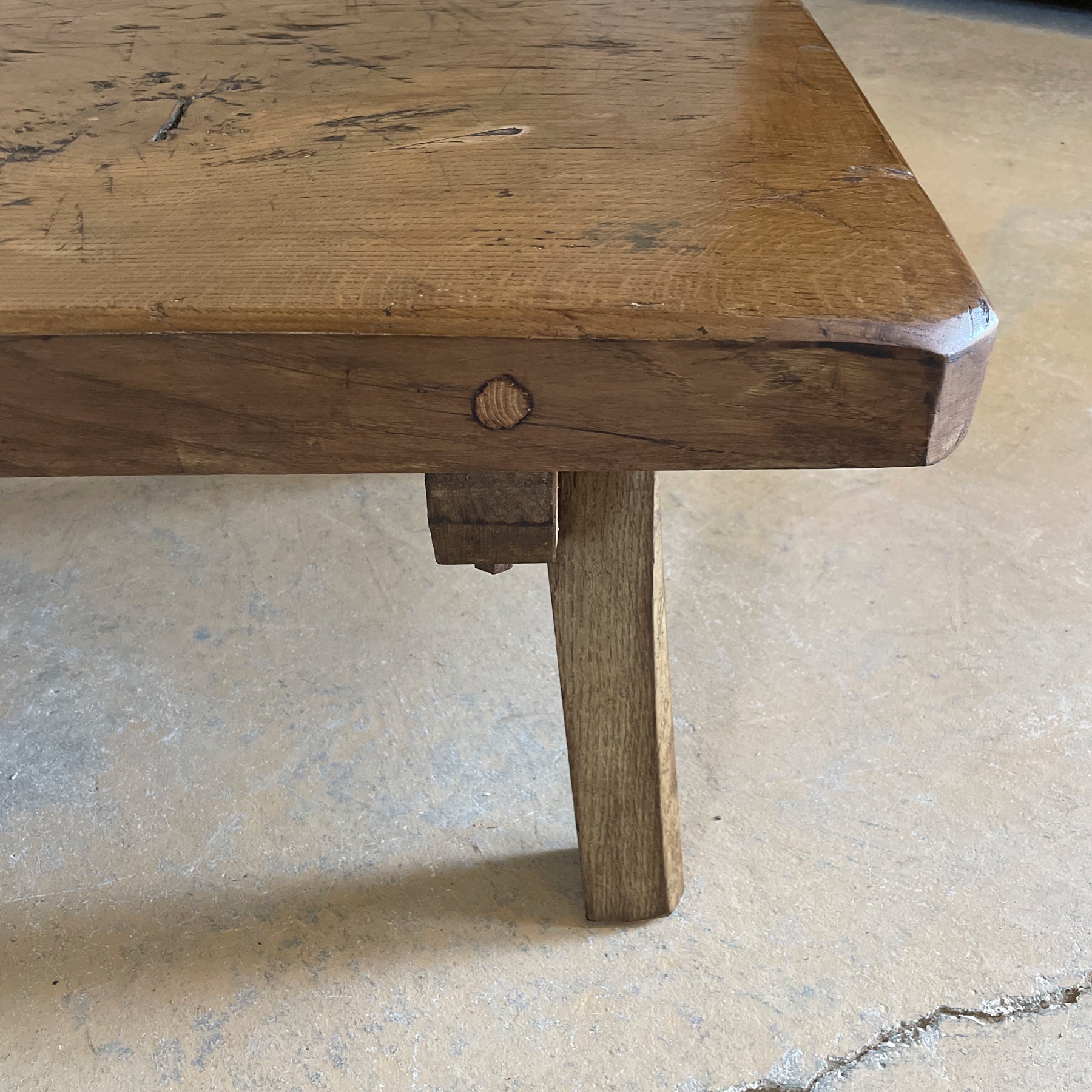 Antique European work table that has been cut to coffee table