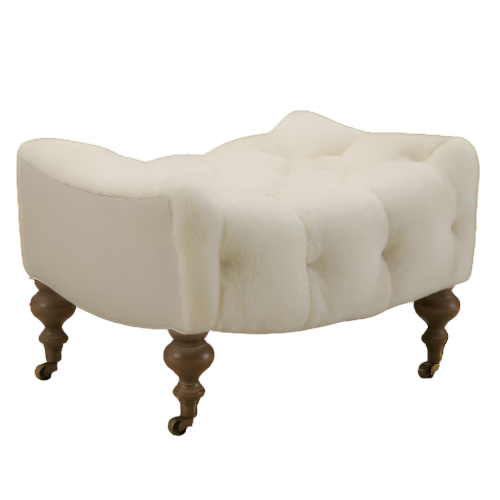 This shearling ottoman is a store favorite and will become your favorite also! Our floor model is in shearling dusty beige Grade 7 with leather buttons, pecan finish and antique brass finished castors. Standard Natural Lee fill.